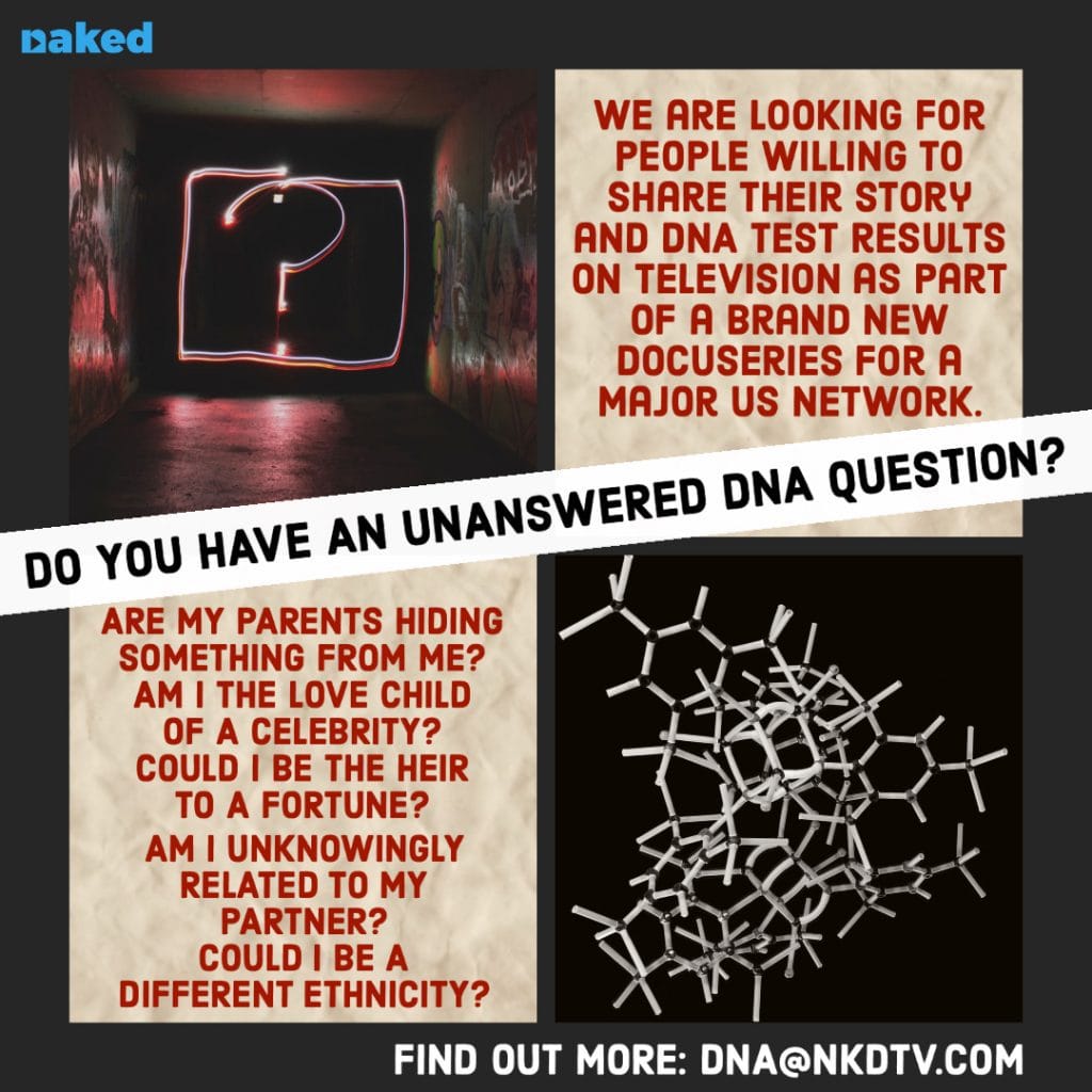 Have you always suspected your family may not be telling the whole truth? Naked Television have teamed up with a Major US Network and are offering advanced DNA testing to solve these life mysteries. We are looking for US citizens willing to share their story and DNA test results on Television as part of a brand new docuseries.