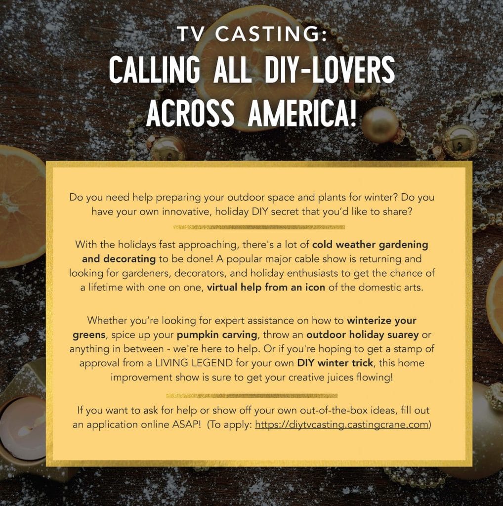 A popular major cable TV show is returning and now casting gardeners, decorators and holiday enthusiasts who would like a chance of a lifetime with a one on one, virtual help from an icon of domestic arts.