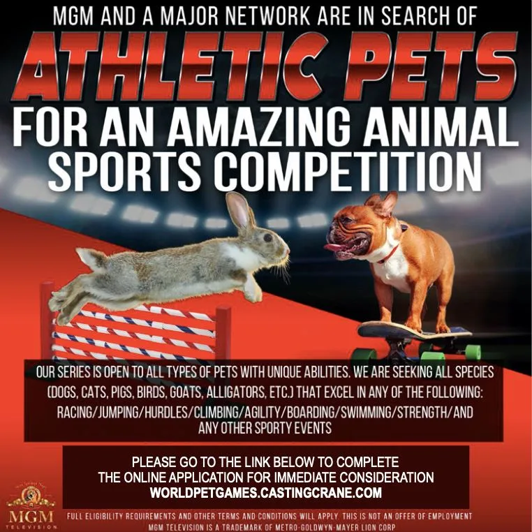 MGM and a major network are in search of Athletic Pets, that’s right, athletic pets. The new show is holding zoom auditions / video auditions for pets and their owners