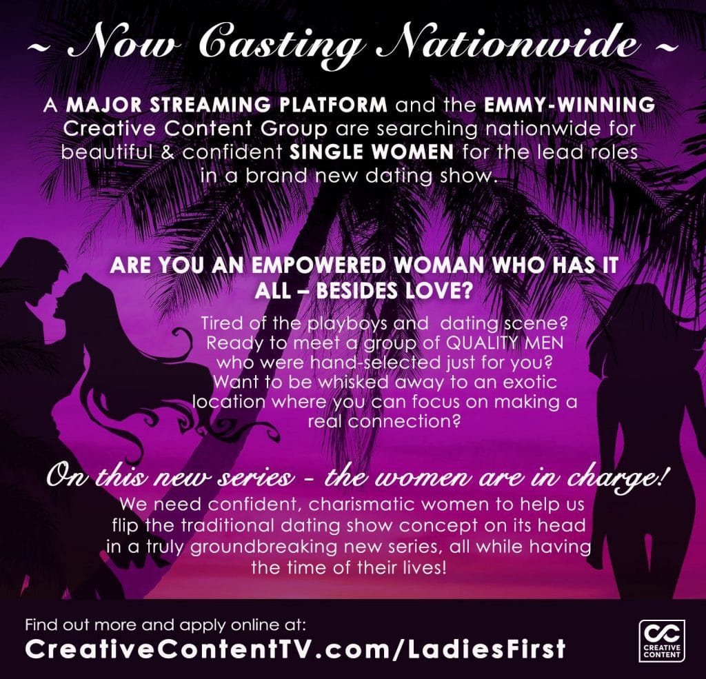 A MAJOR STREAMING PLATFORM and the Emmy-winning Creative Content Group are searching nationwide for confident, sophisticated and beautiful SINGLE WOMEN for the LEAD ROLES in a new dating show where the women are in charge!