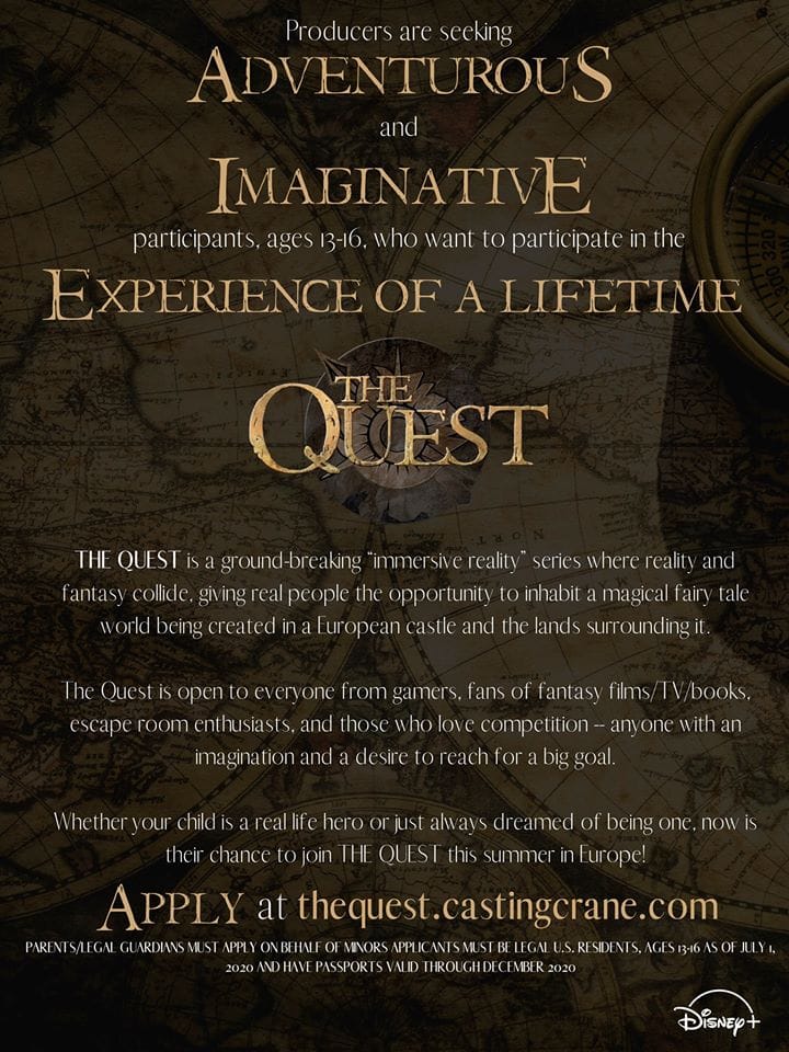 New Disney show, The Quest is now casting teens ages 13 to 16 who would like to be a part of what is described as an immersive reality show that is set in a magical, fairy tale like place.