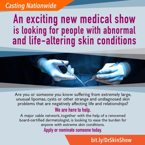 Casting New TV Series similar to Dr. Pimple Popper for a major cable network. Looking for anyone with large multiple lipomas, cysts or other extreme skin conditions.