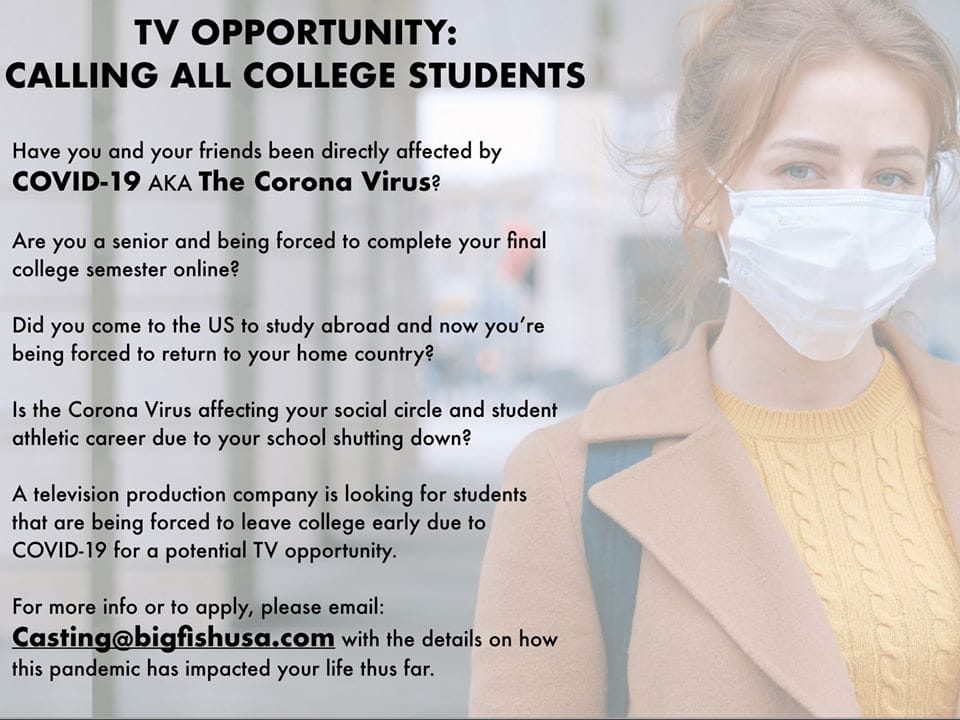 A television production company is looking for students that are being forced to leave college early due to COVID-19 for a potential TV opportunity.