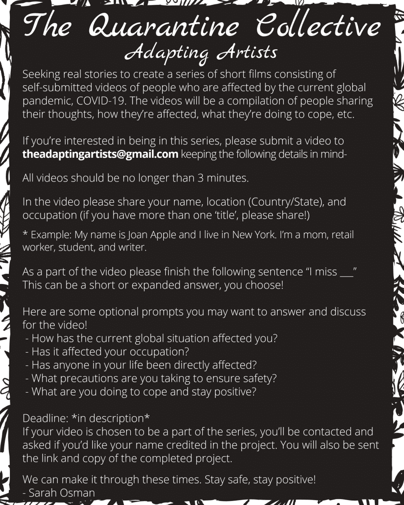 Seeking real stories to create a series of short films consisting of self-submitted videos of people who are affected by the current global pandemic, COVID-19. The videos will be a compilation of people sharing their thoughts, how they’re affected, what they’re doing to cope, etc. Eventually the submitted clips will be sorted into categories of similar experiences.