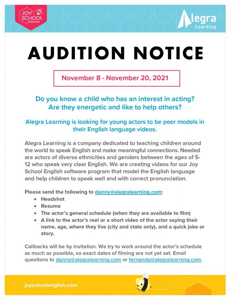 Alegra Learning is looking for young actors to be peer models in their English language videos.