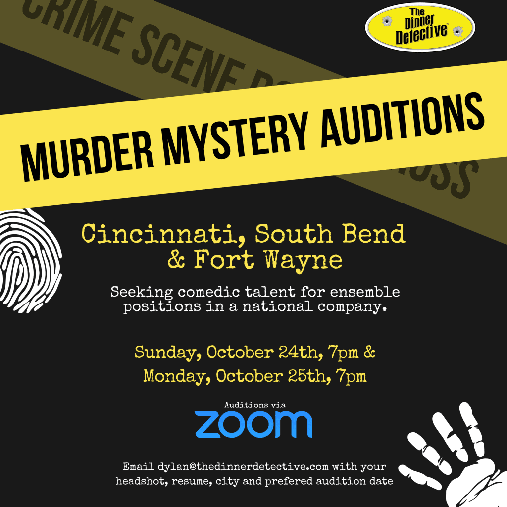 How to Submit: -Please send your headshot, resume, city and preferred audition date to dylan@thedinnerdetective.com -You will receive an email back confirming your audition slot with a Zoom link.