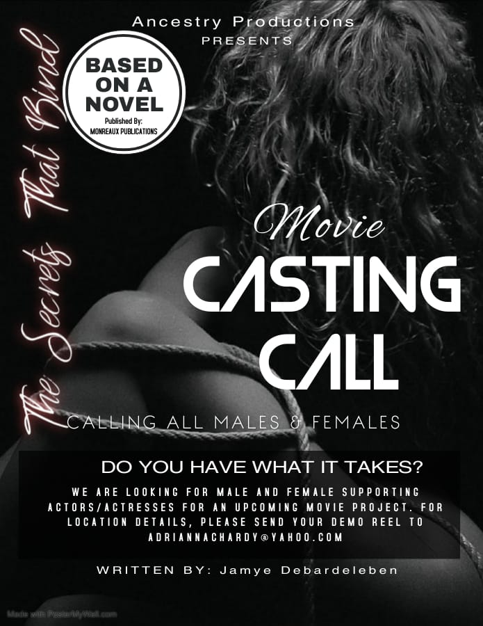 Both auditions are for main roles in our upcoming feature film “The Secrets That Bind”.