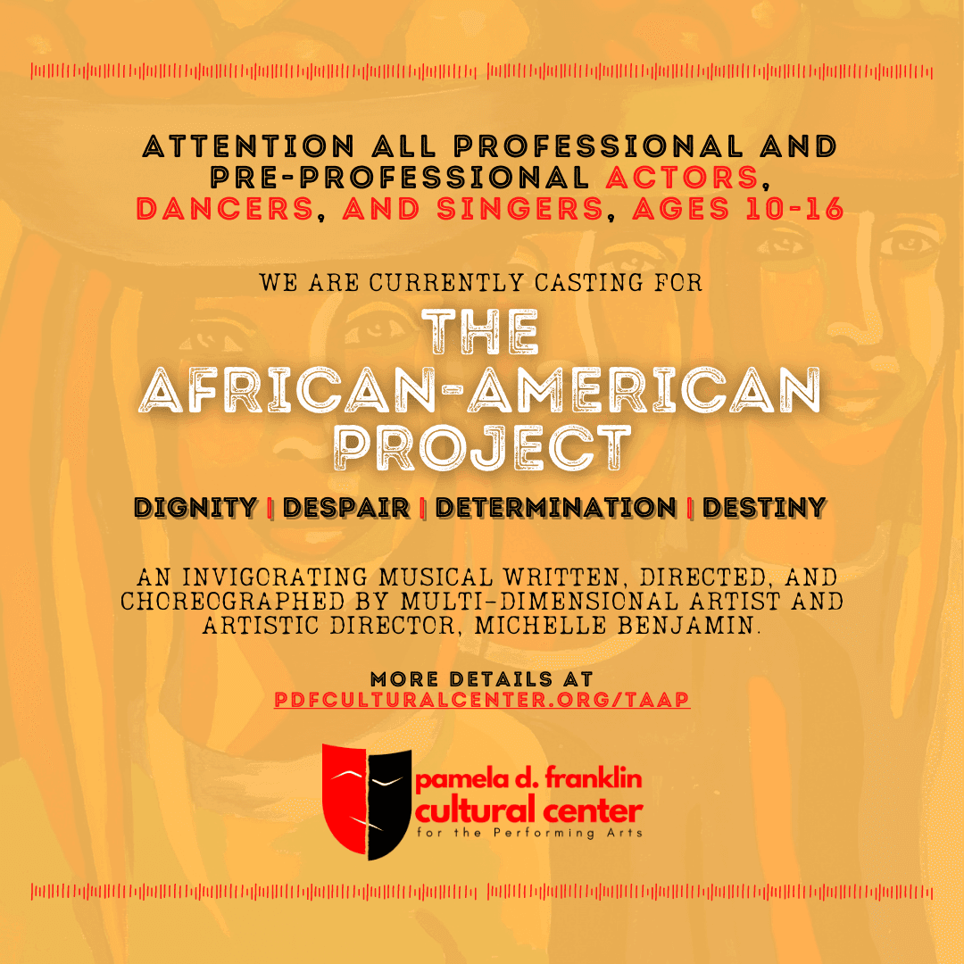We are currently casting Professional and Pre-professional Dancers, Actors, and/or Singers, ages 10-16 to participate in the musical “The African American Project: Dignity, Despair, Determination, Destiny”. This powerful production is a chronological, historic depiction of the African-American experience expressed in a musical format, written, directed and choreographed by Michelle Benjamin, Actress, multi-dimensional Artist and Artistic Director of The Pamela D. Franklin Cultural Center for the Performing Arts.