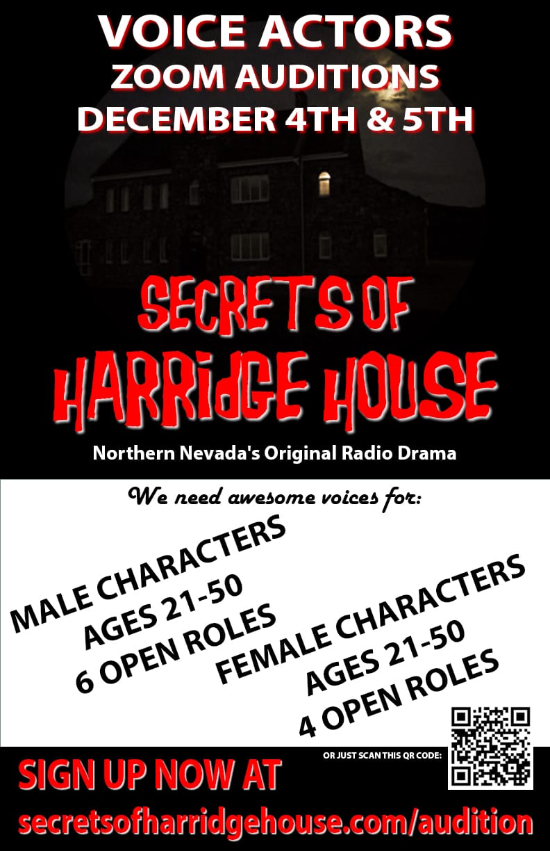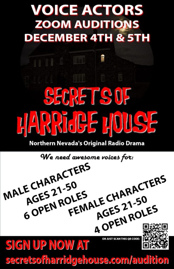 Known as “Northern Nevada’s original radio drama,” Secrets of Harridge House is auditioning voice actors for a 3-episode story arc airing in the middle of its 3rd season. The storyline will introduce our listeners to characters that have only been talked about up to now. We’re looking for 6 male voices (ages 21-55) and 4 female voices (ages 21-55). Auditions will be on Zoom, so a good Internet connection and microphone are needed. We don’t require webcams, as we’re only interested in your voice, not your appearance. Interested actors can register at: