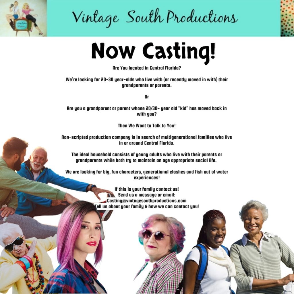 We’re casting NOW in Florida for big, fun personalities in this unique living situation! Looking for adults (20’s-30’s) who have moved in with their parents and / or grandparents or vice versa and having the time of your lives! Generational clashes? Fish out of water experiences…. Know someone please share with them!