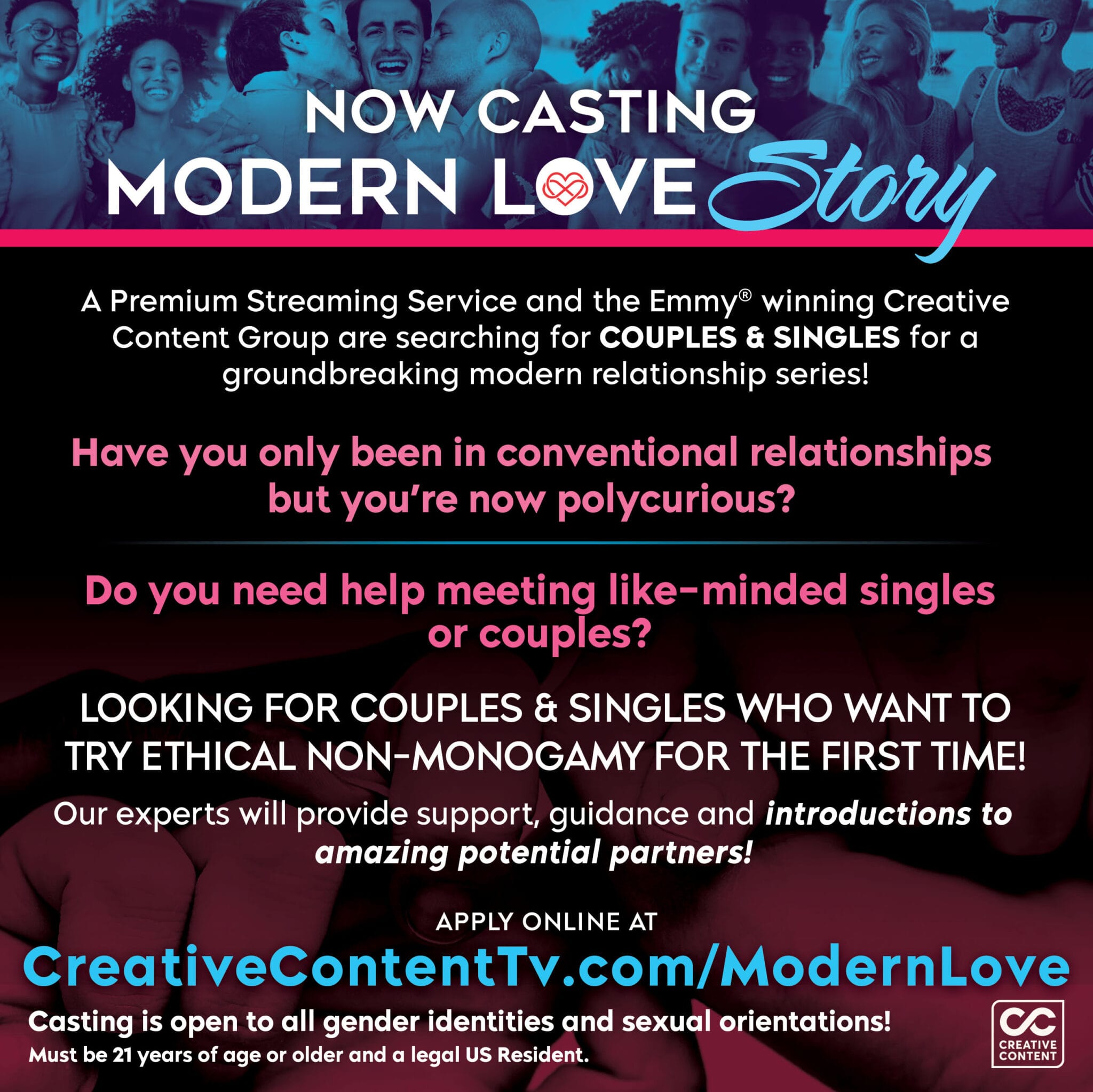 A Premium Streaming Service and the Emmy®-winning Creative Content Group are searching for COUPLES of all gender identities & sexual orientations for a groundbreaking modern relationship series!