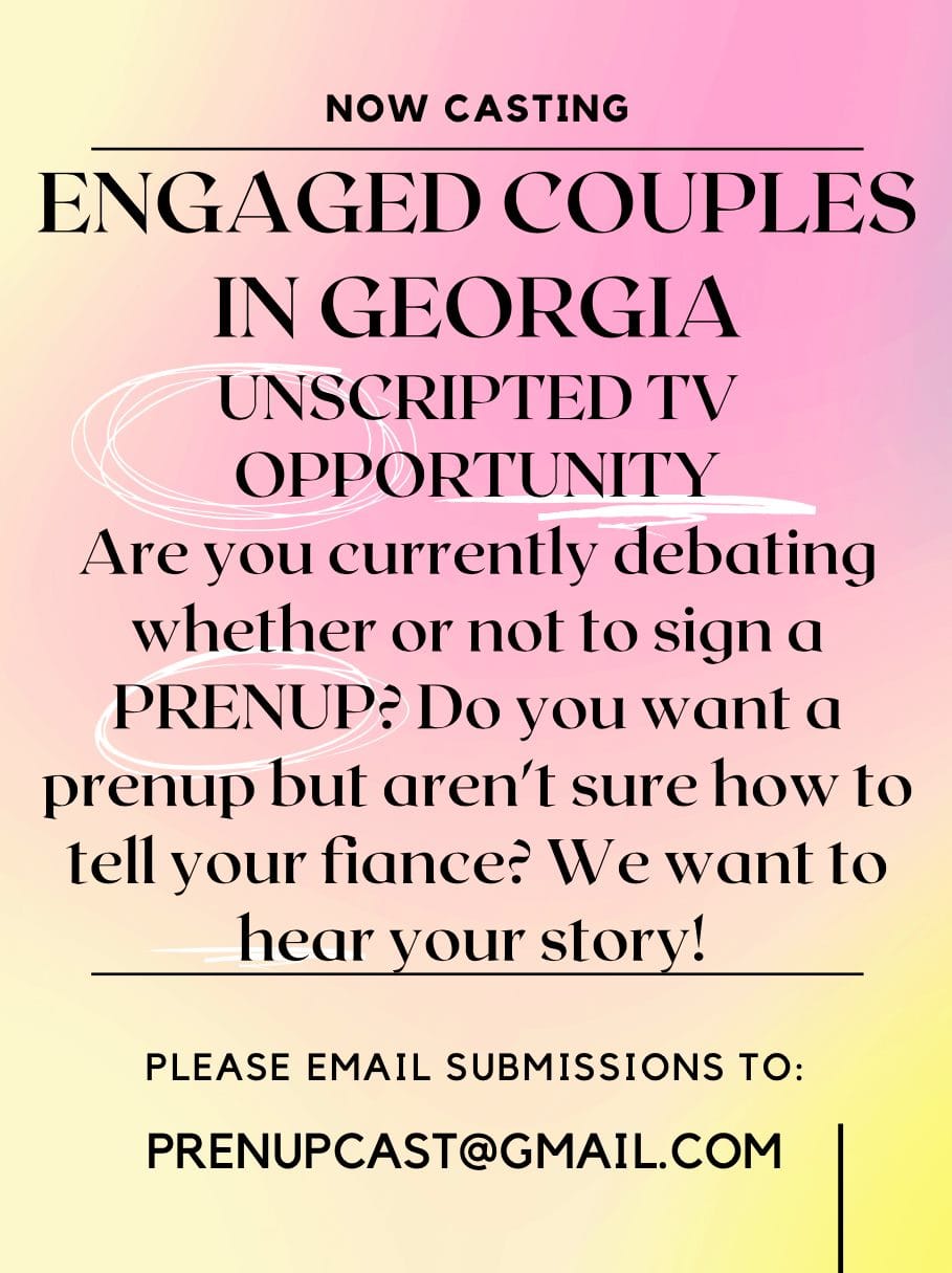We’re looking for ENGAGED COUPLES in Georgia who are debating whether or not to sign a PRENUP. Do you want a prenup but aren’t sure how to tell your fiancé? Is your family pressuring you to get a prenup?