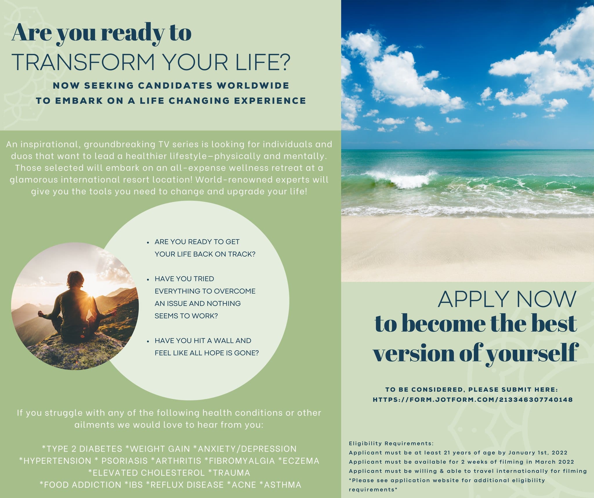 We are looking for duos who would like to partake in an all expenses paid wellness retreat with the goal of transforming their overall well-being. If you suffer from any of the chronic health issues or ailments on the flyer below, apply today to be considered!