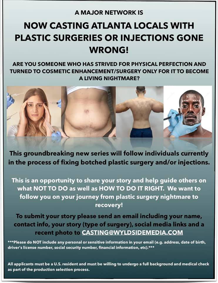 NOW CASTING ATLANTA LOCALS WITH PLASTIC SURGERIES OR INJECTIONS GONE WRONG!