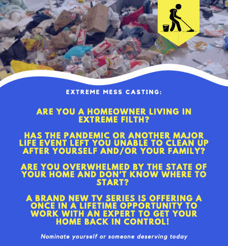 Southern California Locals! A BRAND NEW TV SERIES IS OFFERING A ONCE IN A LIFETIME OPPORTUNITY TO WORK WITH AN EXPERT TO GET YOUR HOME BACK IN CONTROL! ?ARE YOU A HOMEOWNER LIVING IN EXTREME FILTH? ?HAS THE PANDEMIC OR ANOTHER MAJOR LIFE EVENT LEFT YOU UNABLE TO CLEAN UP AFTER YOURSELF AND/OR YOUR FAMILY? ?ARE YOU OVERWHELMED BY THE STATE OF YOUR HOME AND DON’T KNOW WHERE TO ?START? ?Nominate yourself or someone deserving today