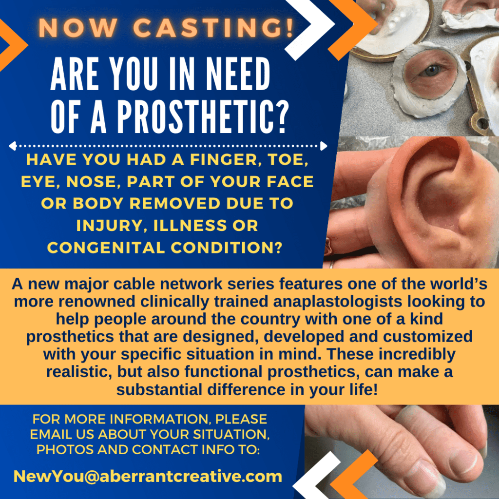 A new major cable network series features one of the world’s more renowned clinically trained anaplastologists looking to help people around the country with one of a kind prosthetics that are designed, developed and customized with your specific situation in mind. These incredibly realistic, but also functional prosthetics, can make a substantial difference in your life!