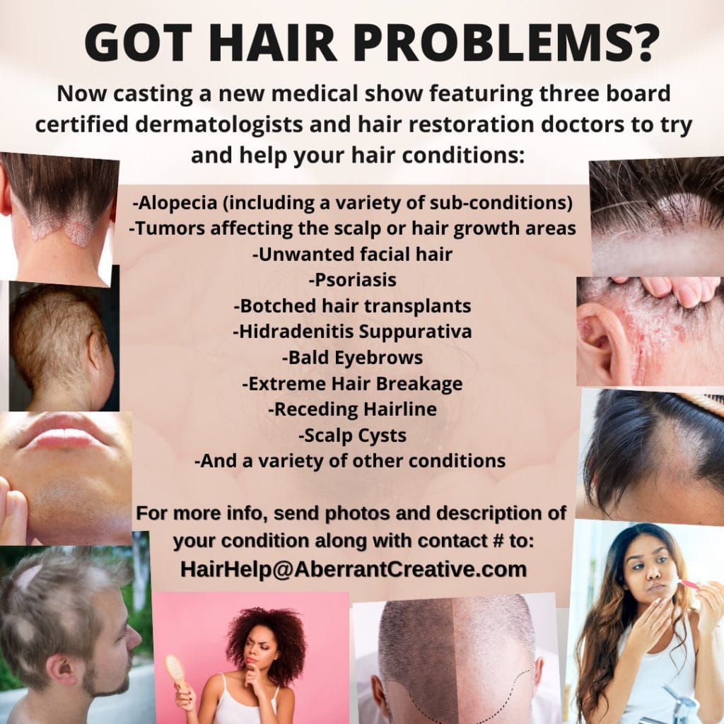 In this new docu-series, three board certified female hair surgeons and dermatologists are looking to help people from around the country who are dealing with medical conditions that are affecting ANY hair area, anything from dermatological issues to different types of hair loss, or even unwanted hair growth. Email hairhelp@aberrantcreative.com to be considered today!