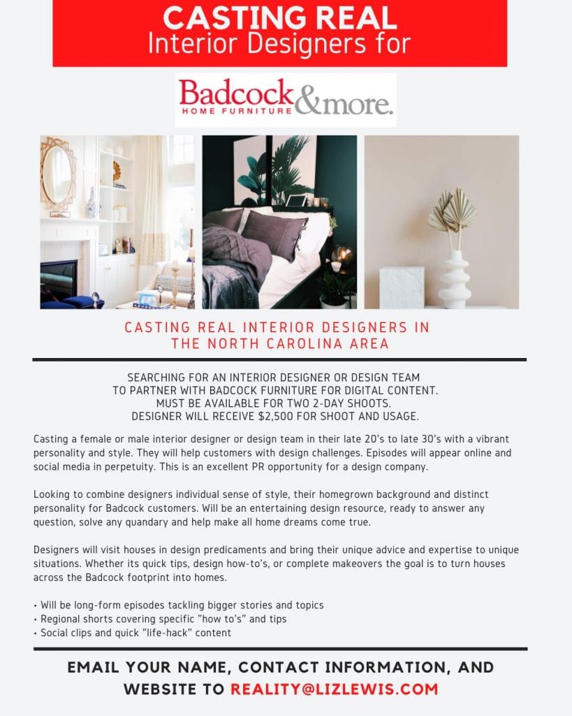 Liz Lewis Casting Partners is casting a web series for major furniture store Badcock Home Furniture & More. Searching an interior designer or design team with a vibrant personality and style to partner with Badcock to help real customers with design challenges. Must be available for two 2-day shoots. Designer will receive $2,500 for shoot and usage.