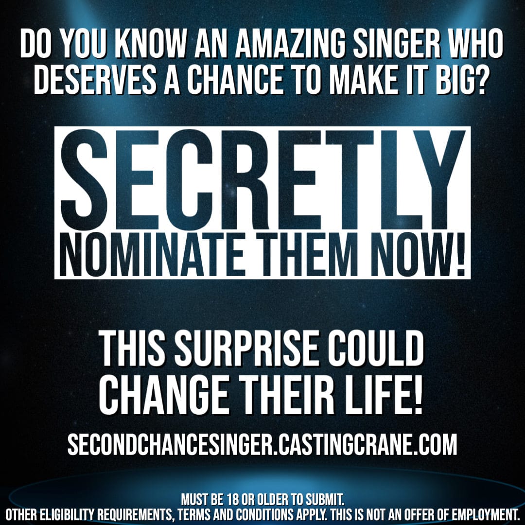 Do you know an incredible singer that deserves a second chance at making it? Has life gotten in the way of their dreams, are they working a 9-5 and have stopped pursuing their music dreams?