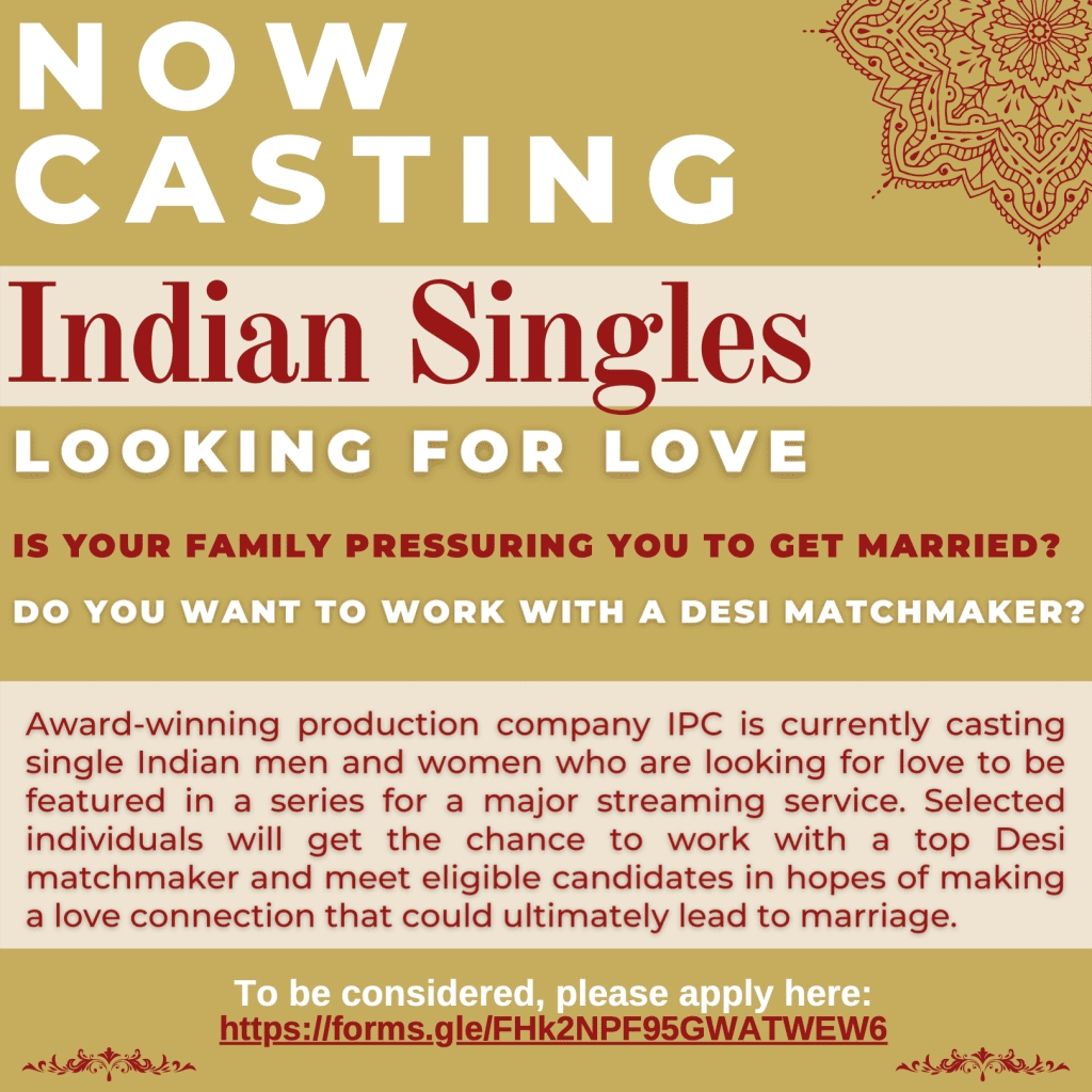 An award-winning production company is currently casting single Indian men and women who are looking for love to be featured in a series for a major streaming service. Selected Individuals will get the chance to work with a top Desi matchmaker and meet eligible candidates in hopes of making a love connection that could ultimately lead to marriage.