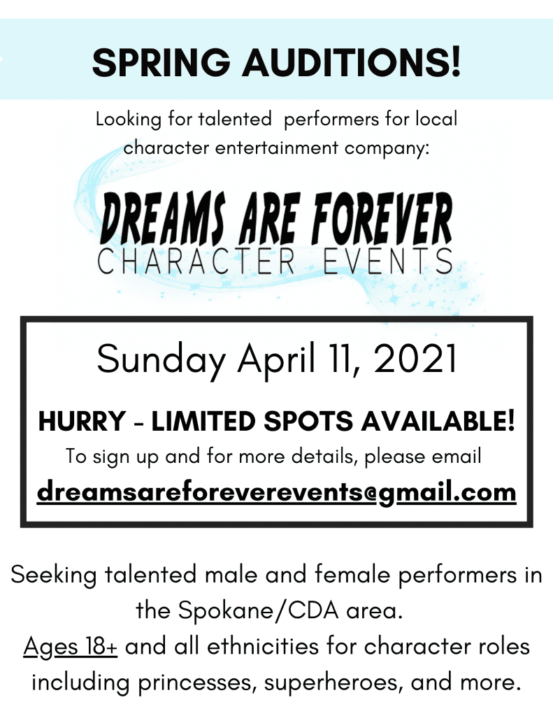 Casting call for talented performers in the Spokane/CDA area for character roles including Disney princesses, superheroes, and more to perform at local events, parties, and productions.