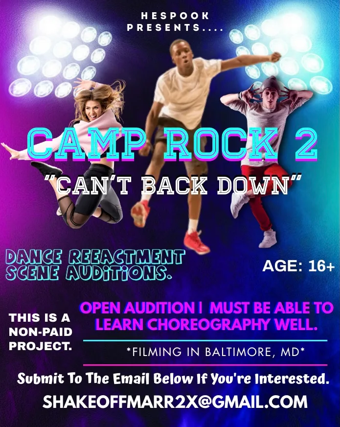 Hello everyone I am recreating the “Can’t back down” dance choreography from camp rock 2!! Yes it will be in Baltimore Maryland filming but anyone is welcomed to audition! Please email me your availability for the last week of March and the first to second week of April. send me 3 pictures of yourself full body and selfie and your Instagram name phone number and I’ll get back to you with the rest of the information! Thanks.