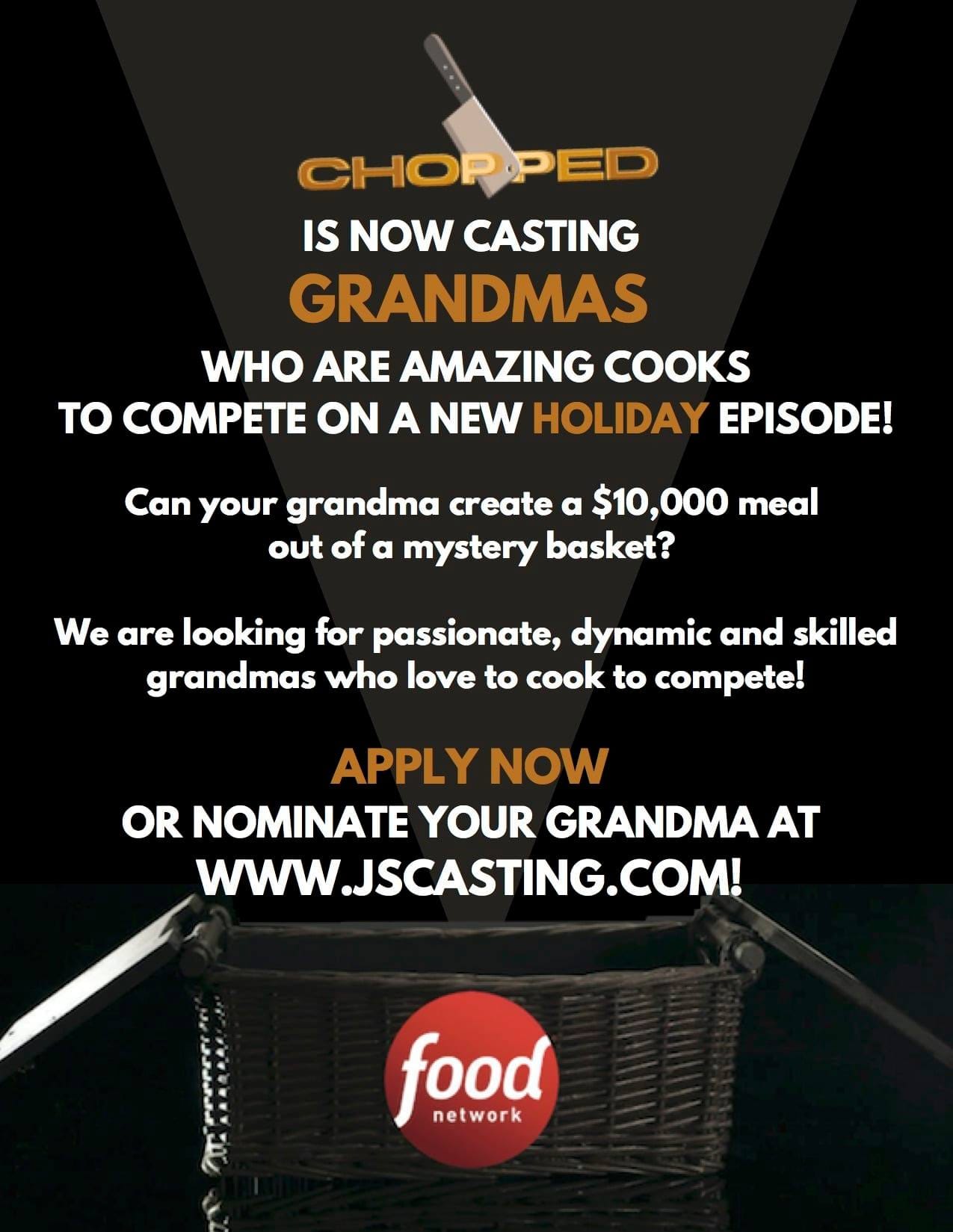 The hit Food Network cooking reality competition Chopped is now casting grandmas who are amazing cooks to compete on Chopped for some upcoming holiday episodes.