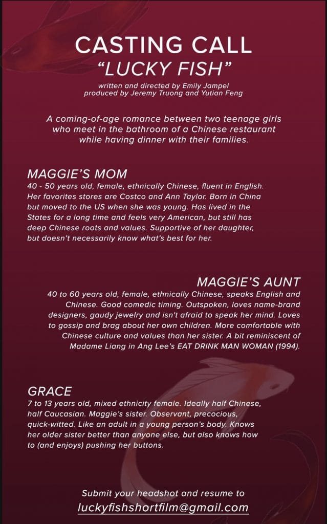 Please send your headshot, resume and performence reels to luckyfishshortfilm@gmail.com. Once we receive your information, we will scheudle a virtual audition for you.