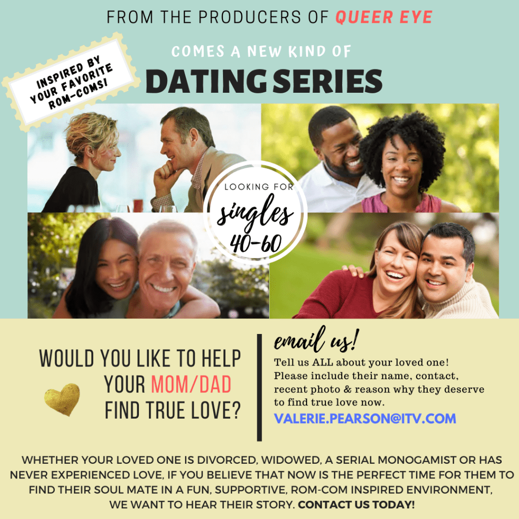 Would you love to help your mom or dad find true love? Whether your loved one is divorced, widowed, a serial monogamist or has never experienced love, if you believe that now is the perfect time for them to find their soul mate in a fun, supportive, rom-com inspired environment… Show producers want to hear the story.