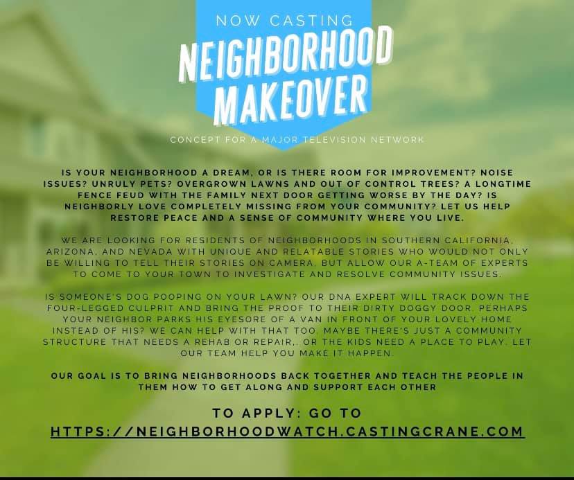 Is your neighborhood a dream or is their some room for improvement? Got some noise issues? Issues with some noisy neighborhood pets? Does someone have a crazy lawn or maybe a neighbor has some totally out of control trees? Are you in a neighborhood feud with the family next door or going to war over a fence? If so, this show and its casting directors would love to hear all about your your neighborhood issues and maybe they can help in getting it worked out.