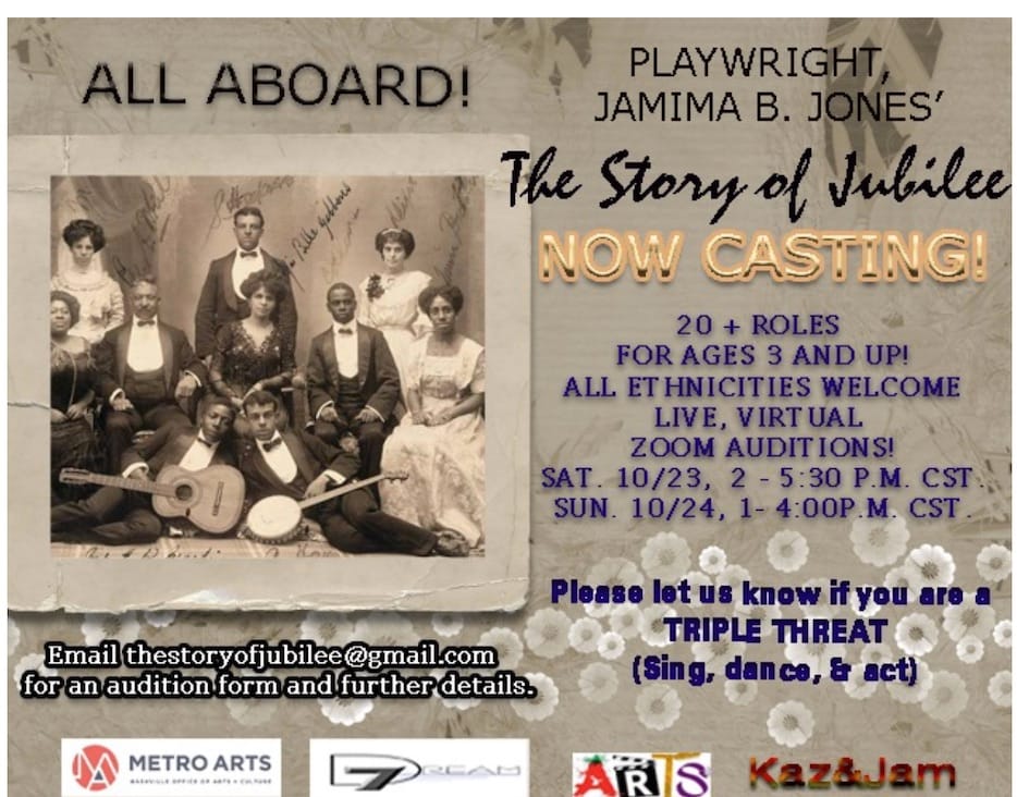 A Two-Act Musical about the backstories of the newly-freed teens who became the original Fisk Jubilee Singers. Partially funded by a Metro Arts Nashville Thrive Grant. Honorarium Pay. Play runs the first 2 weekends of Black History Month 2022 at the Z. Alexander Looby Theatre in Nashville. MUST BE FULLY COVID-VACCINATED to audition. Must live in or near Nashville, TN. Casting for a White Female age 30 and up to play Mrs. George White.