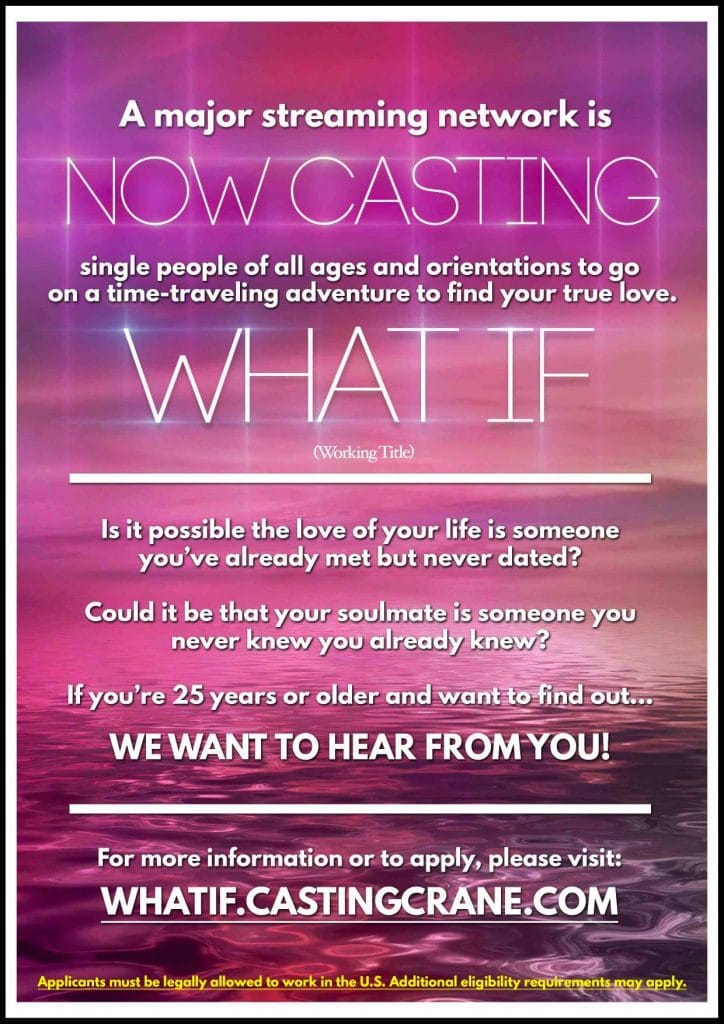 Now casting singles who have wondered would could’ve been! If you are ready to find your soulmate, apply at https://whatif.castingcrane.com/