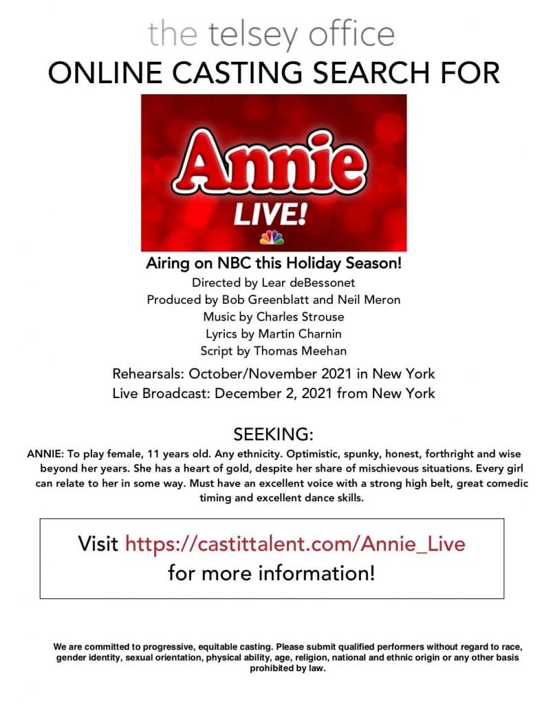 New York City Casting Directors at Telsey are holding an online talent search for the Live, televised version of Annie to be filmed in New York City in December.