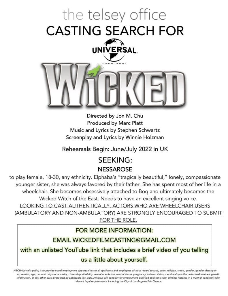 Open call for the role of NESSAROSE in the “Wicked” film!