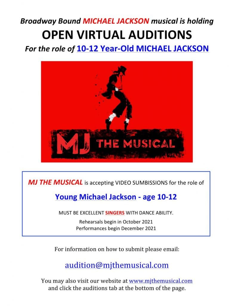 Broadway bound Michael Jackson musical is holding open virtual / video auditions for the role of a young Michael Jackson in the musical. Casting directors for the show are accepting submissions to fill the role of Michael between the ages of 10 and 12.