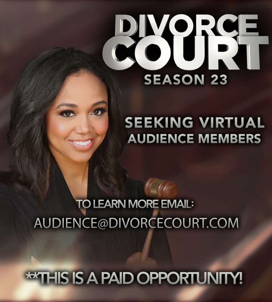 Divorce Court is seeking virtual audience members for “Divorce Court” an American court show that revolves around settling the disputes of couples going through divorces. As of August 24, 2020, the presiding judge is Faith Jenkins.