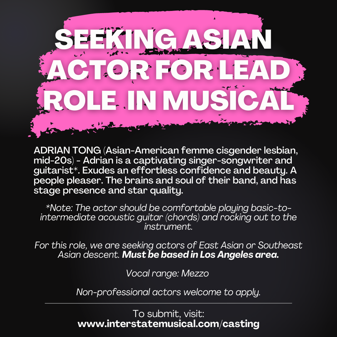 The production is looking to fill the lead role of Adrian Tong. Auditions will be held in the Los Angeles area and performers applying must be local to the Los Angeles Area.
