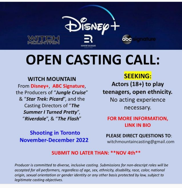 The Disney+ project is filming in the Toronto area and Disney casting directors have an open casting call to fill roles in Witch Mountain.