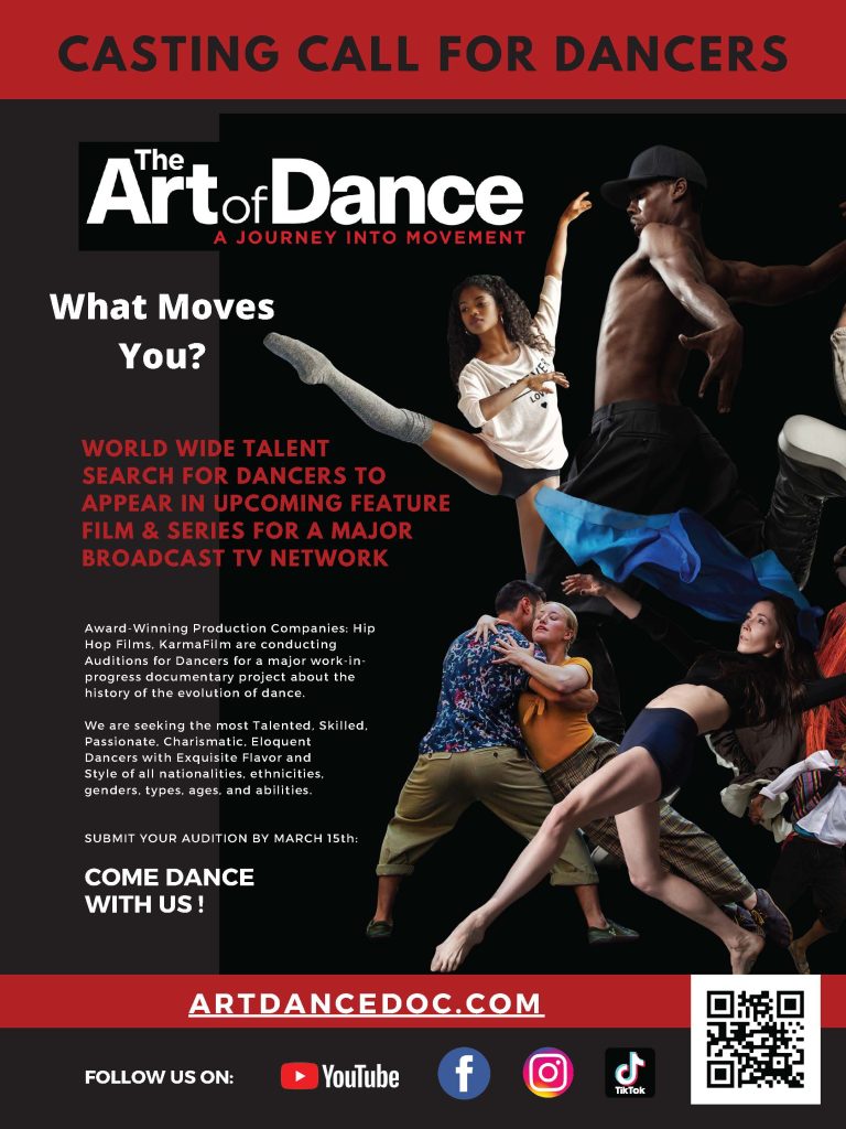 Award-Winning Production Companies: hiphopfilms.ca, karmafilm.ca, innonative.ca and level.film/#/ are casting for an Immersive Cinematic Dance Experience: Feature Film, TV-Series, and Live Tour about the historical evolution of dance. Executively Produced by Spike Lee’s Director of Movement and Choreographer Miaji Garcia (BlacKkKlansman, Chi Raq, She’s Gotta Have it, Fela). With musical score by Cinematic Orchestra. Featuring Ken Swift (Rock Steady Crew), Archie Burnett, Moncell Durden, Lady C, B-Boy Neguin, Storm, and Boogie Frantic. We are seeking to audition the most Talented, Skilled, Passionate, Charismatic, Eloquent Dancers with Exquisite Flavor and Style of all nationalities, ethnicities, genders, types, ages, and abilities.