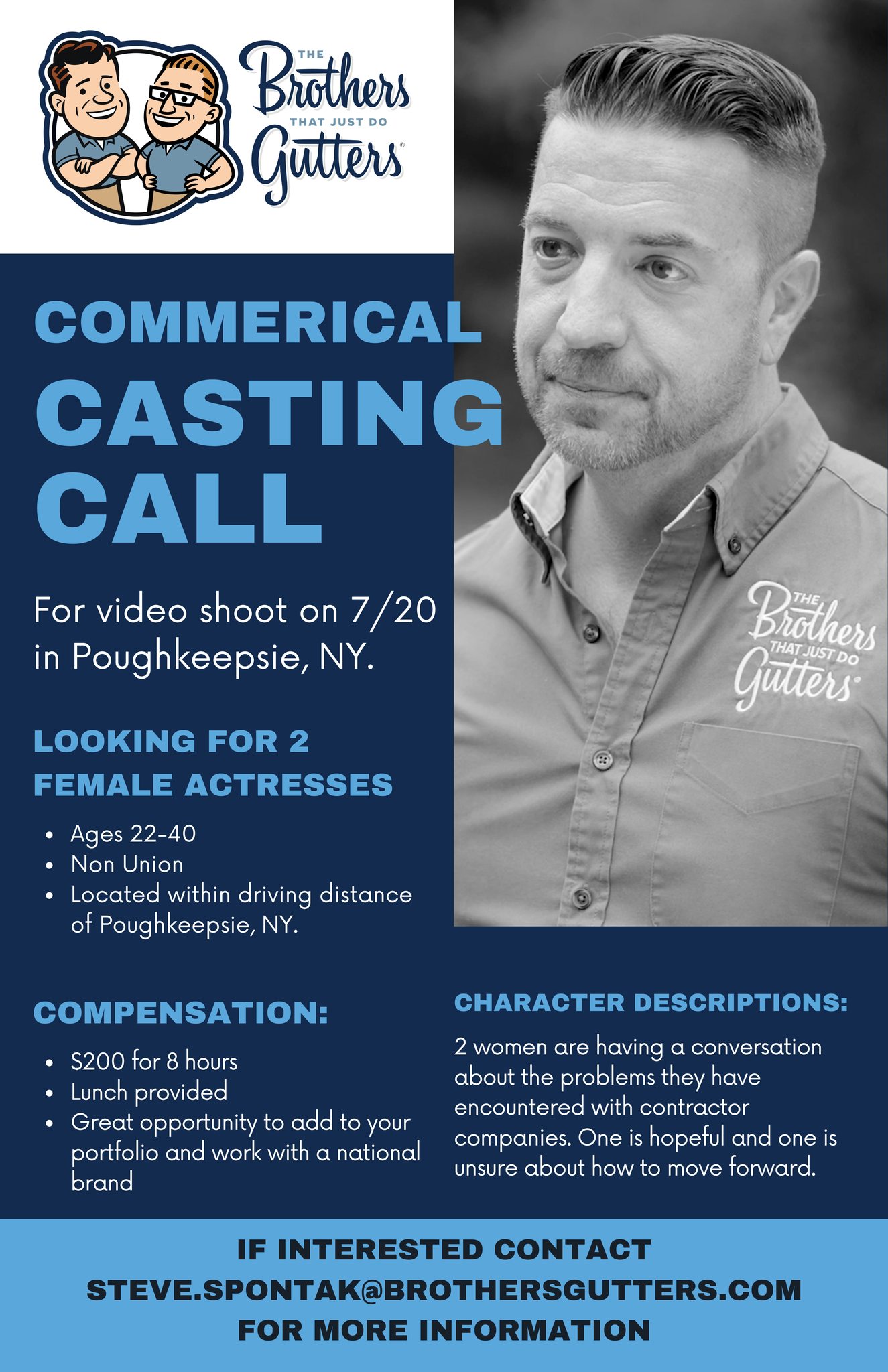 The Brothers that Just do Gutters are looking for an actress local to the Hudson Valley / Poughkeepie, New York area. The production is holding local auditions for actresses who live in and around Poughkeepsie, NY who are between the ages of 22 and 40, are non union and are available to work in the area shortly for a shoot that they saw will be a 1 day gig.