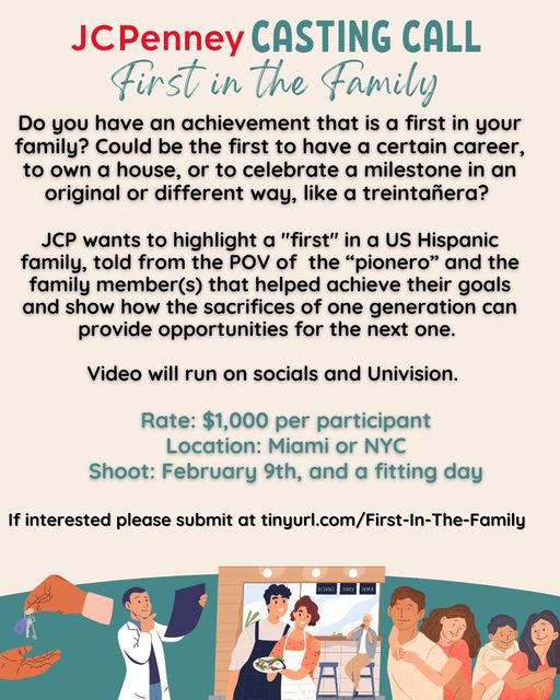 JCPenney is casting Hispanic people and their families in the NY or Miami areas, who have a milestone or achievement that is a “first” in their family. Such achievements could be the first to own a house, the first to have a specific career, or be the first to celebrate a milestone in a unique way (ie. someone who wasn’t able to have a quinceañera, so is having a treintañera).