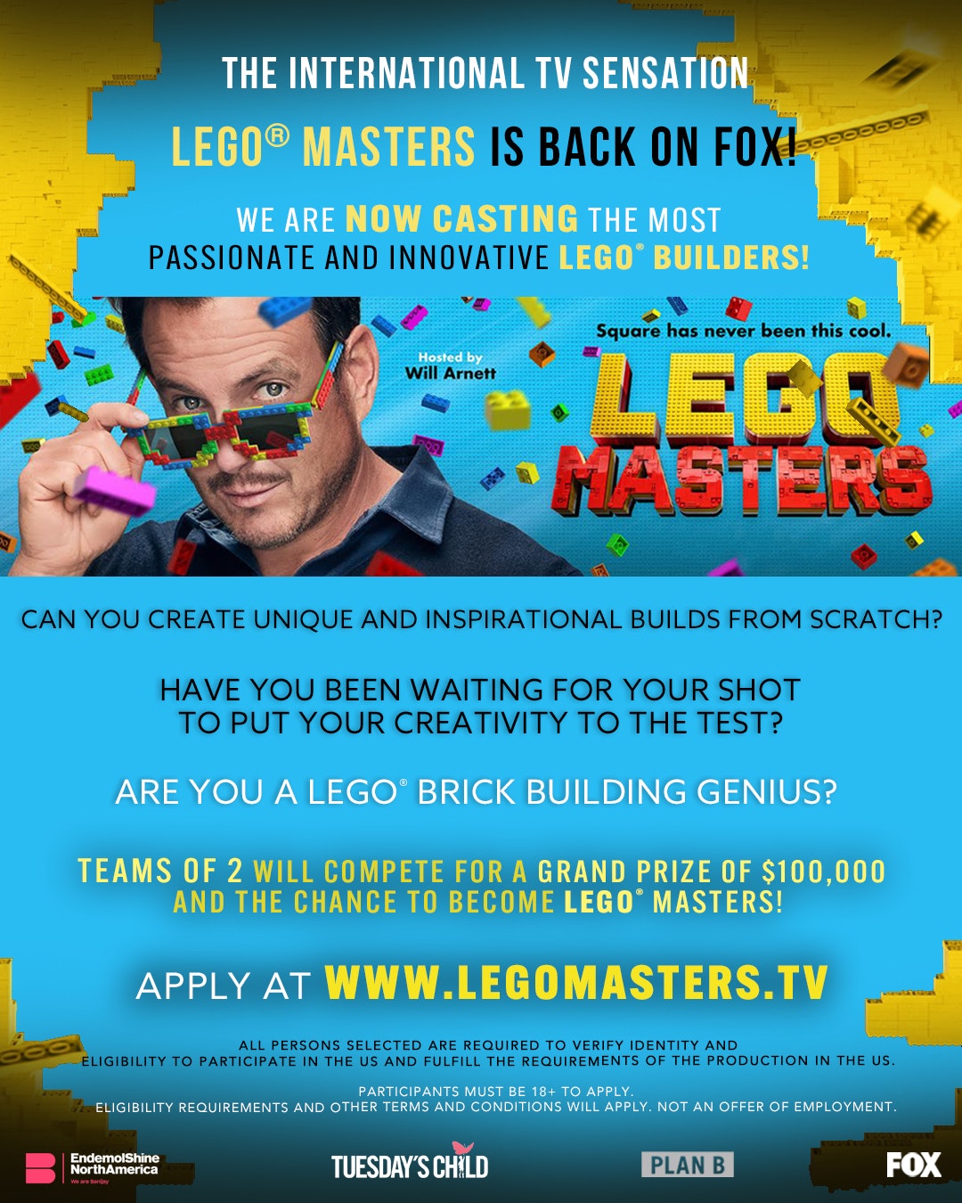 The FOX reality competition is holding online auditions for Lego Masters. Casting directors for Lego Masters are looking for the most passionate and innovative Lego builders around who are able to create truly unique and inspirational Lego build from scratch… that’s right, from scratch, as in no instructions required into a design of their own.