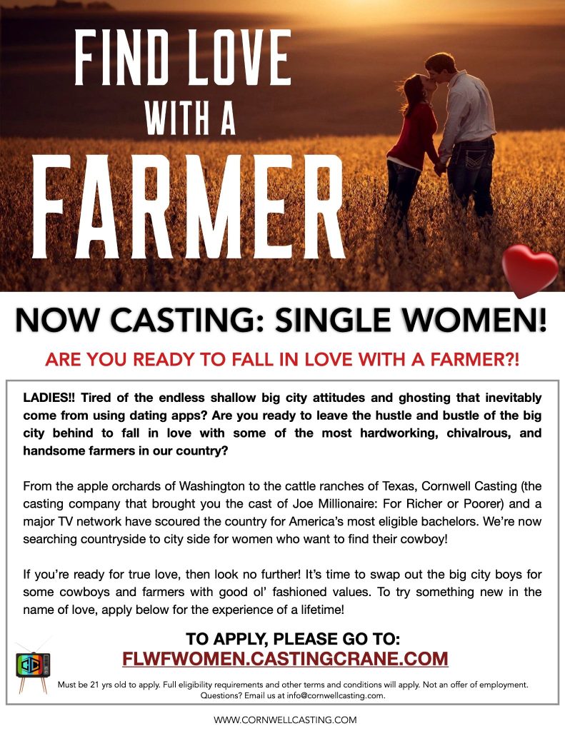 Are you ready to find love with a farmer? If so, read on because Cornwell Casting is looking for ladies that are ready to find their perfect match….in farm country.