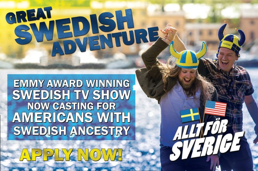 We are looking for Americans with Swedish ancestry. We are casting season 11 of this extremely popular award-winning TV show Great Swedish adventure (Swedish title Allt för Sverige) We are looking for people 19-70 years old that is very much into their Swedish roots and would love to go to Sweden to explore their heritage this might be for you. Or if you know someone of some Swedish blood… please let them know about this extraordinary show.