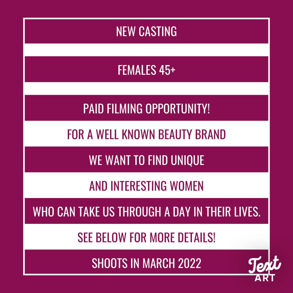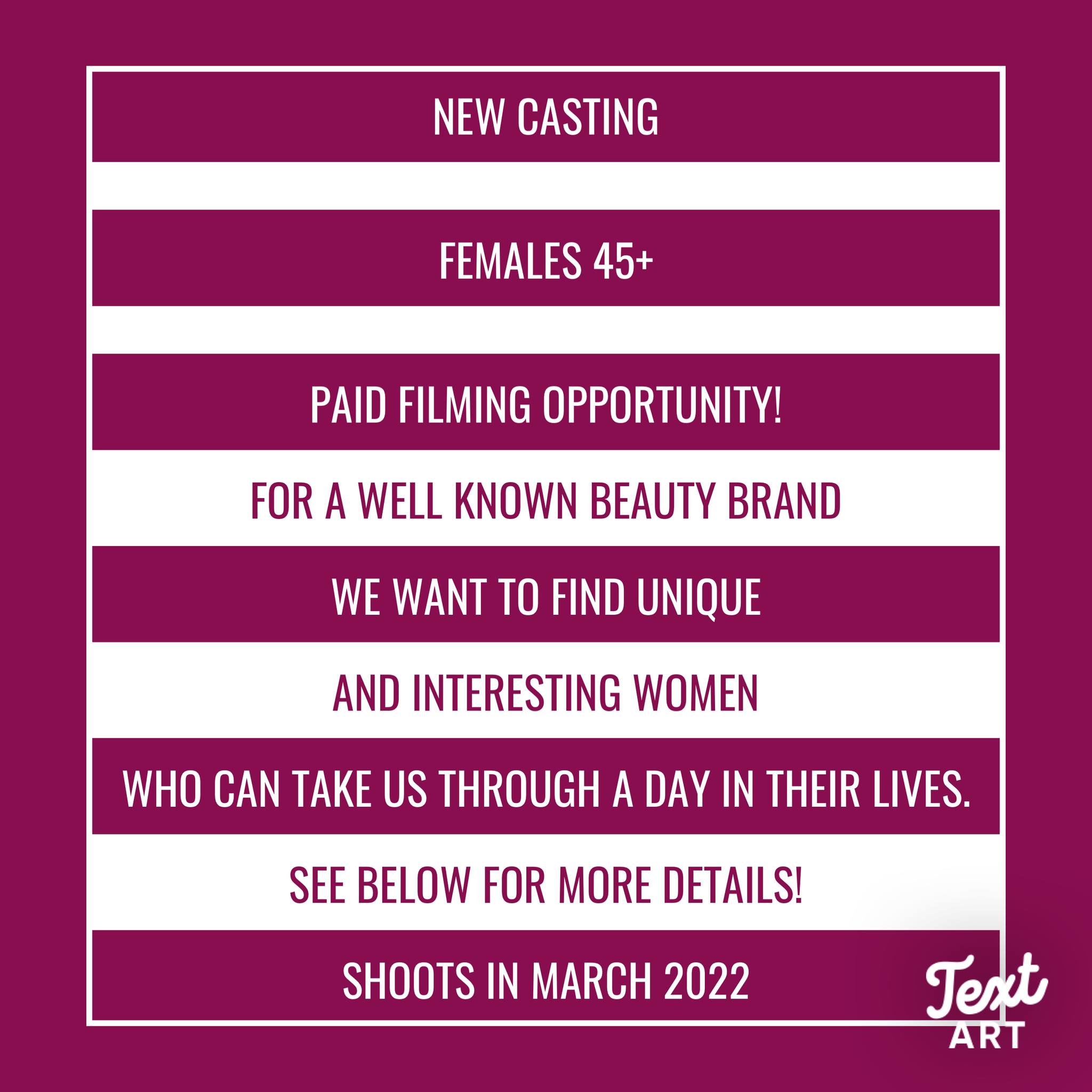 Gleam studios are looking for women 45+ to take part in being filmed for this exciting digital branded content for a well-known beauty brand.
