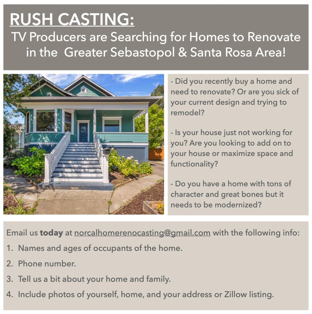 TV Producers are Searching for Homes to Renovate in the Greater Sebastopol & Santa Rosa Area!