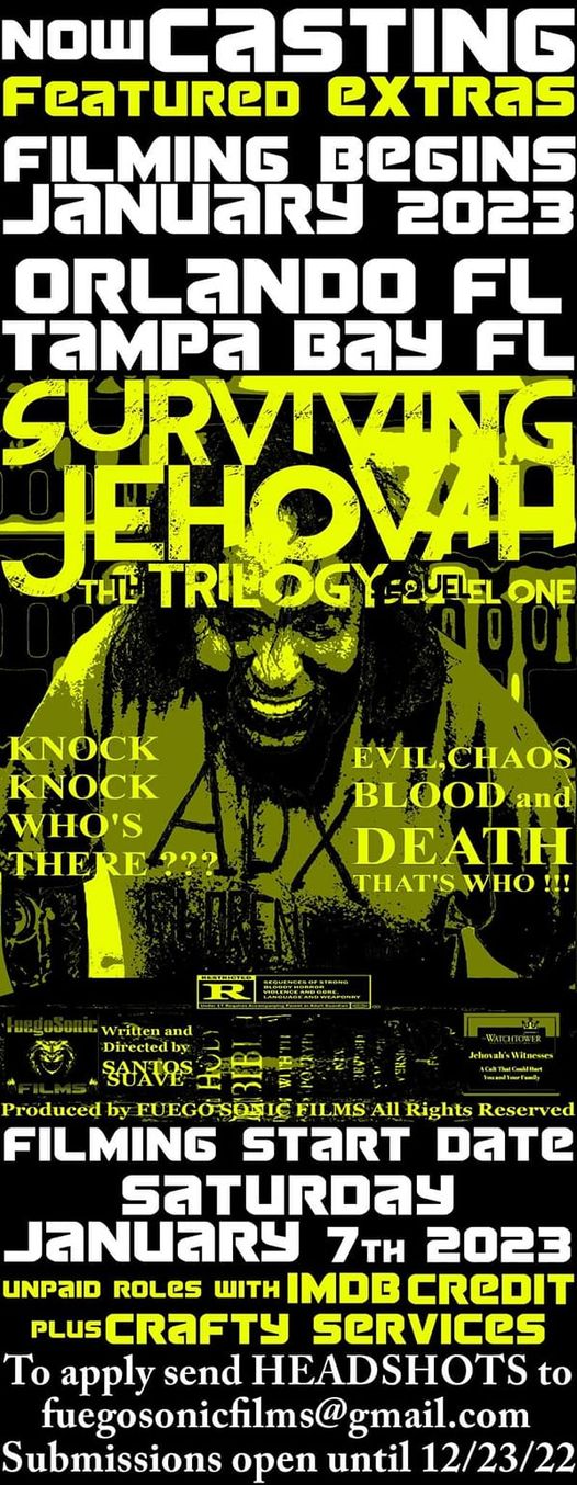 FUEGO SONIC FILMS is now officially casting several FEATURED EXTRA Roles and 1 MALE CHILD Role for the film SURVIVING JEHOVAH.