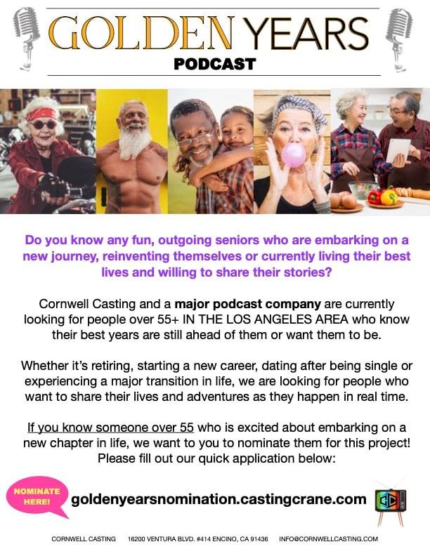 A major podcast producer is now casting for folks who are 55+ and actually live in the L.A. area who are aware that the best years of their lives lie ahead of them or people that would love the best years of their lives to be those years that are coming up.