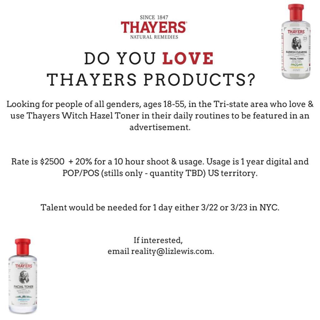 That reside in the NY Tri-state area who love & use Thayers Witch Hazel Toner in their daily routines to be featured in an advertisement.