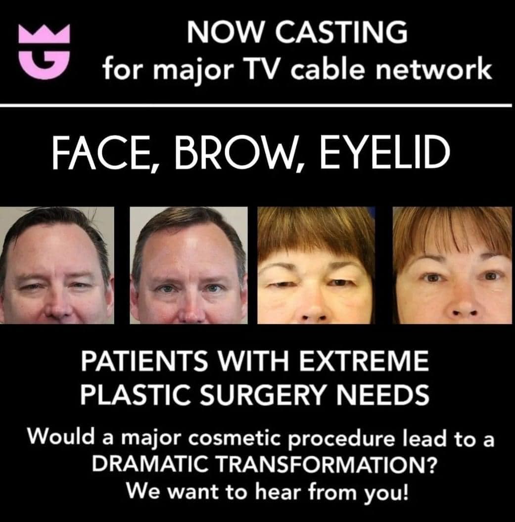 If so, a major cable network show and the casting directors for that show may want to hear all about what you would like to do on your face. Specifically, the casting directors for the show are seeking people who are in need of work to their face, brows or eyelids and their needs are what would be an extreme transformation of those areas.